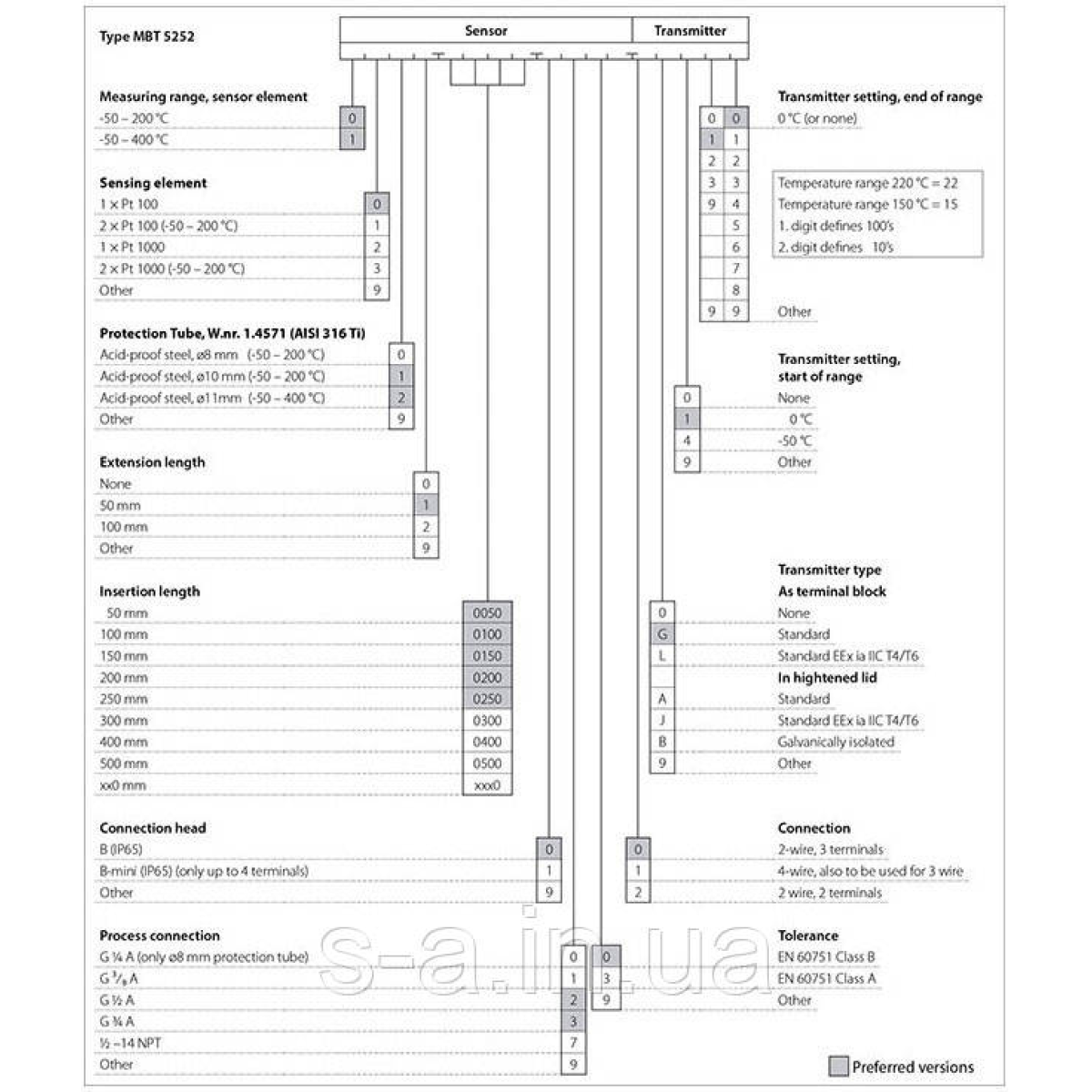 Усі деталі, що контактують із робочими середовищами, виготовлені з неіржавкої сталі AISI 316 Ti. У стандартному варіанті датчик MBT 5252 забезпечений головкою В, але за запитом можлива поставка датчика з головкою В-міні або з головкою В з нарізною кришкою.