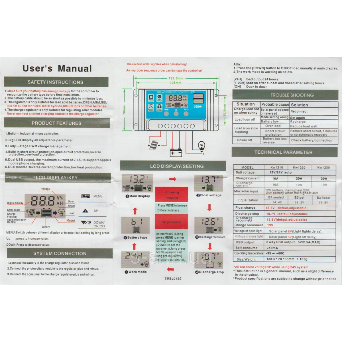 PWM(ШІМ) Контролер захищає акумулятор від перезаряду, перерозряду і втрати заряду вночі. Контролер може працювати при напрузі 12В або 24В. Струм надходить на акумулятор від сонячної батареї і струм споживаний навантаженням не повинні перевищувати 30А. Специфікація: