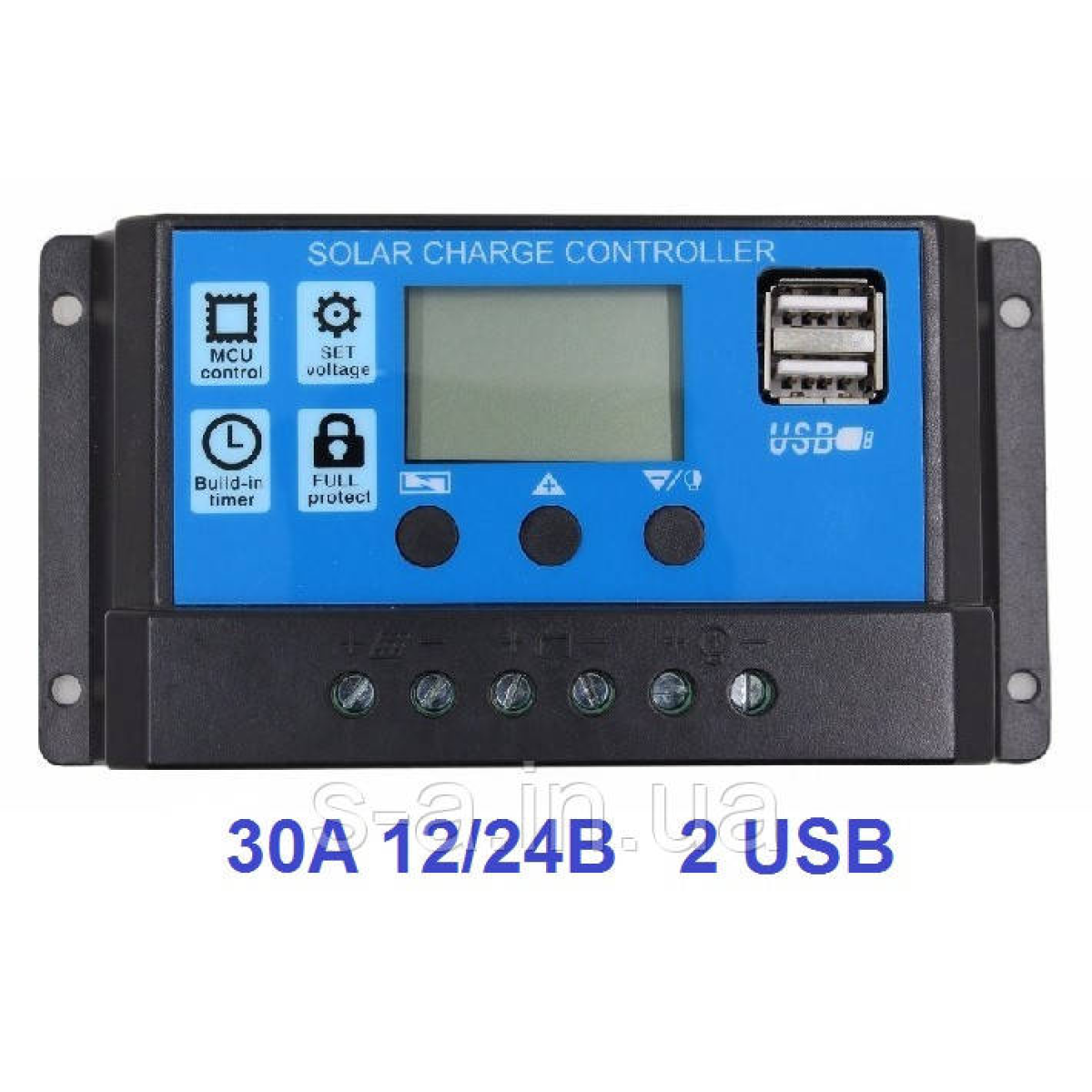 30А 12/24В Контролер заряду сонячних батарей (модулів) ШІМ (PWM) з Дисплеєм + 2USB
