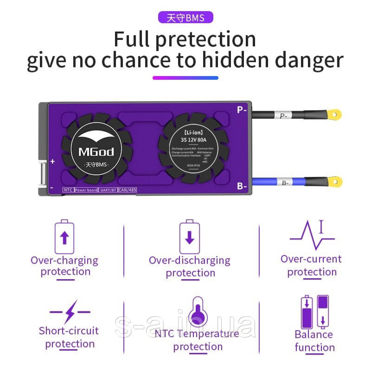 BMS плата MGod LiFePO4 - проконтролює всі процеси в акумуляторі і захистить його від перевантажень, коротких замикань, передчасного виходу з ладу та інших Акб-проблем.