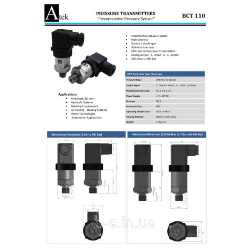 Датчики тиску води, повітря, олії, газів BCT110, BCT210