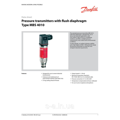 Компактні перетворювачі тиску MBS 4010 призначені для загально промислового застосування й можуть працювати в умовах, забезпечуючи водночас надійні та точні вимірювання. Широка виробнича гама перетворювачів цього типу охоплює різні типи приєднань імпульсних ліній, електричних з“єднань і вихідних сигналів. Є варіанти вимірювання як відносного, так і абсолютного тиску. Відмітними рисами цих перетворювачів є висока вібростійкість, надійна конструкція та чудова перешкодозахищеність. Перетворювачі цього типу відповідають найсуворішим вимогам промисловості.