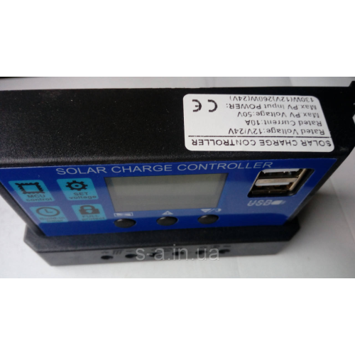 PWM(ШІМ) Контролер захищає акумулятор від перезаряду, перерозряду і втрати заряду вночі. Контролер може працювати при напрузі 12В або 24В. Струм надходить на акумулятор від сонячної батареї і струм споживаний навантаженням не повинні перевищувати 10А. Специфікація: