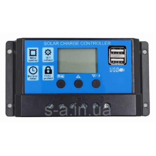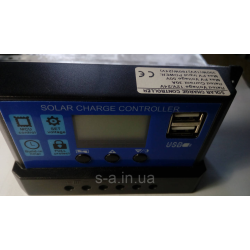 PWM(ШІМ) Контролер захищає акумулятор від перезаряду, перерозряду і втрати заряду вночі. Контролер може працювати при напрузі 12В або 24В. Струм надходить на акумулятор від сонячної батареї і струм споживаний навантаженням не повинні перевищувати 30А. Специфікація: