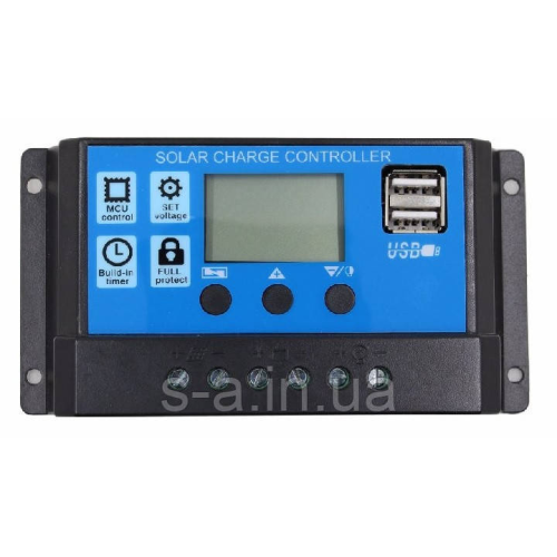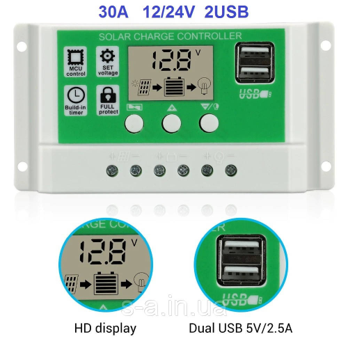 PWM(ШІМ) Контролер захищає акумулятор від перезаряду, перерозряду і втрати заряду вночі. Контролер може працювати при напрузі 12В або 24В. Струм надходить на акумулятор від сонячної батареї і струм споживаний навантаженням не повинні перевищувати 30А. Специфікація: