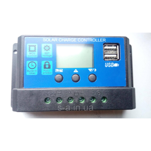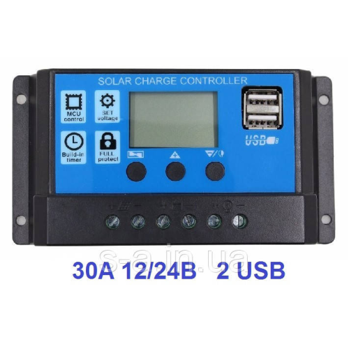 PWM(ШІМ) Контролер захищає акумулятор від перезаряду, перерозряду і втрати заряду вночі. Контролер може працювати при напрузі 12В або 24В. Струм надходить на акумулятор від сонячної батареї і струм споживаний навантаженням не повинні перевищувати 30А. Специфікація: