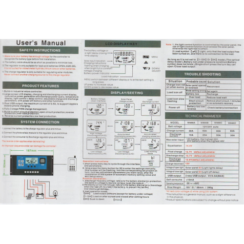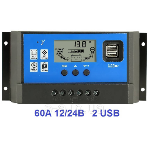 PWM(ШІМ) Контролер захищає акумулятор від перезаряду, перерозряду і втрати заряду вночі. Контролер може працювати при напрузі 12В або 24В. Струм надходить на акумулятор від сонячної батареї і струм споживаний навантаженням не повинні перевищувати 60А. Специфікація: