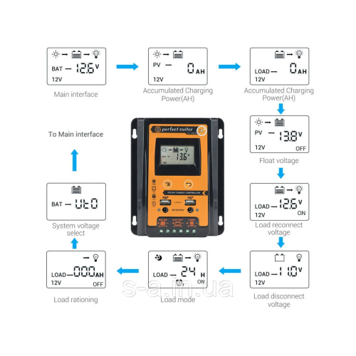 Даний контролер заряду для сонячних панелей призначений для автоматичного заряду і розряду акумуляторів. Він не допускає перезаряду і глибокого їх розряду, оскільки це негативно позначається на роботі акумуляторів. Контролер автоматично визначає напругу акумуляторів і підлаштовується під нього. Тип акумуляторів можна встановити в налаштуваннях