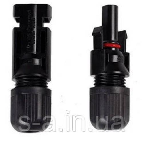 На сонячних модулях (батареях) з клемної коробки виходит кабель з такими раз“ємами. МC4 полегшують монтаж сонячних модулів (батарей) та забезпечують надійне герметичне з“єднання.