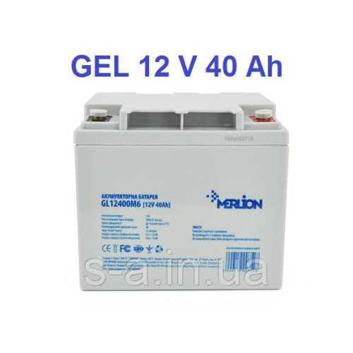 40Аг Гелевий акумулятор для систем резервного та автономного живлення, Сонячних електростанцій СЕС MERLION GL12400M6 12 V 40 Ah (198 x 165 x 170 ) White Q1/96, GEL