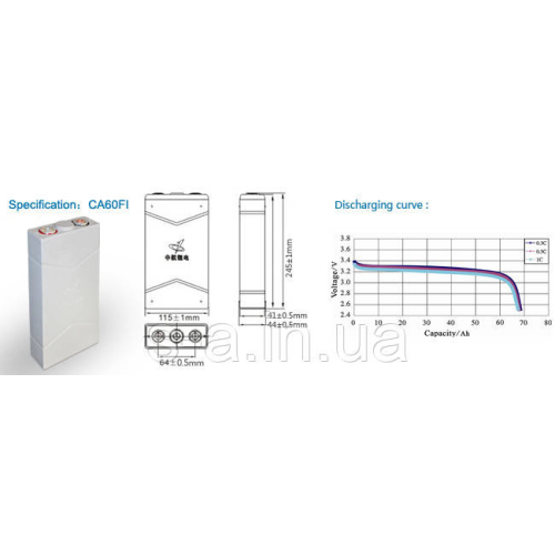 Літій-залізо-фосфатний АКБ (LiFePO4) — сучасна акумуляторна батарея, з понад 4000 циклів заряджання-розряджання, абсолютно нечутлива до режимів хронічного недозаряджання. Має вбудовану плату керування акумуляторною батареєю (Battery Management System). Заряджається постійною напругою й постійним струмом, без стадій. На об“єктах малої енергетики в режимах постійного циклування дають змогу використовувати втричі меншу власну ємність АКБ, порівнюючи зі олив“яно-кислотними акумуляторами завдяки допустимому глибокому розряджанню до 80% (DoD 80%). Модуль має вбудований захист від перенапруг, низького заряду, підвищених струмів.